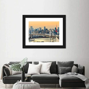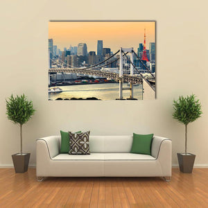 This canvas art beautifully captures the vibrant Tokyo skyline featuring the iconic Rainbow Bridge and Tokyo Tower. The warm orange hues of the sunset create an expansive, urban atmosphere, making it a striking addition to any wall decor.