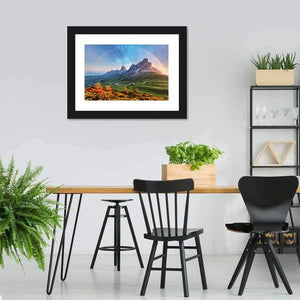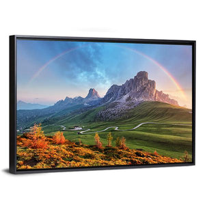 This canvas artwork captures the serene beauty of the Alps, featuring majestic mountains, a vibrant rainbow arching across the sky, and a winding road that invites exploration. The rich palette of greens and blues evokes a hopeful atmosphere, making it a perfect addition to any nature-inspired décor.