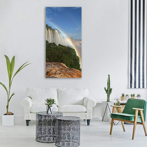 This canvas shows Iguazu Falls with cascading water and a prominent rainbow arcing across lush greenery. Rendered in a realistic, vivid style with greens, blues and warm highlights, the scene feels majestic and serene. It fits modern room decor and nature-themed spaces.