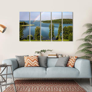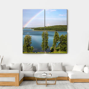 Bring home the serene beauty of Stroust Lake with this captivating canvas art. Featuring a vibrant rainbow arching over calm waters and dense forests, it evokes a peaceful and hopeful atmosphere, perfect for nature lovers.