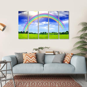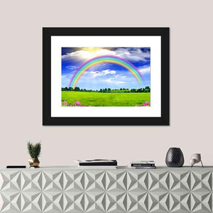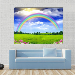 This canvas wall art features a vibrant rainbow arching over a peaceful green field, dotted with wildflowers. It's a bright and optimistic piece that brings the beauty of nature indoors.