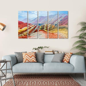 Experience the vibrant beauty of the Rainbow Mountains of Zhangye with this stunning canvas art. The piece showcases layered terrain, featuring striking color striations and rolling hills set against a blue sky with scattered clouds, capturing the majestic essence of nature.