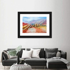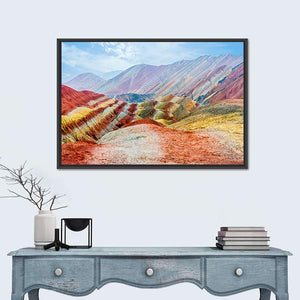 This vibrant canvas captures the awe-inspiring rainbow mountains of Zhangye, showcasing distinct layered rock formations and soft clouds in the sky. Perfect for adding a touch of natural beauty to your space.