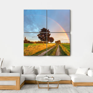 This canvas artwork features a vibrant rainbow arcing over a peaceful country road and lush green fields. The serene scene is infused with warm tones of gold and orange, evoking feelings of hope and tranquility. It's a beautiful addition to any nature-themed décor.