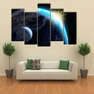 This canvas wall art features a vibrant sunburst on Earth's horizon, set against a serene backdrop of space. The detailed lunar surface adds depth to this celestial scene, inviting awe and reflection.