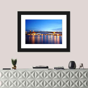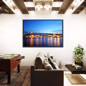 This canvas shows Rama 9 Bridge in Bangkok with a realistic city skyline and lights reflected on the river. Deep blues meet warm orange and yellow highlights to create a serene, vibrant nocturnal mood. Suited to modern home decor and living rooms seeking a calm urban focal point.