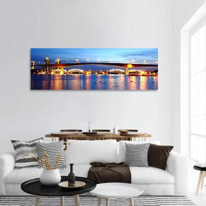 This panoramic canvas captures Rama 9 Bridge in Bangkok with the city skyline and waterfront under an urban night sky. Glowing lights and reflective water stand out in a modern, vibrant blue, orange, yellow, and black palette. It suits modern living rooms or office spaces that welcome contemporary cityscapes.