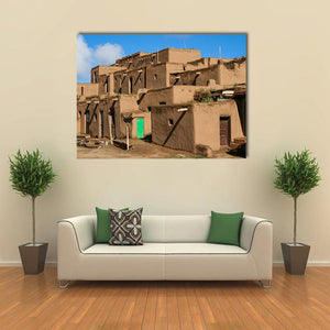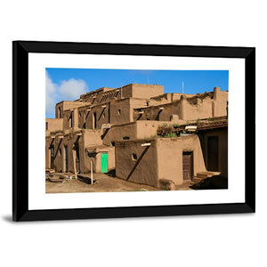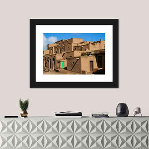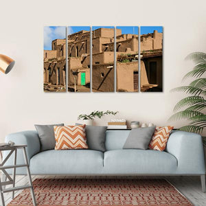 This canvas artwork captures the serenity of historic Ranchos De Taos, showcasing stunning adobe buildings and rustic pueblo architecture. The rich browns, vibrant greens, and gentle blues create a peaceful ambiance, making it a beautiful addition to any space.