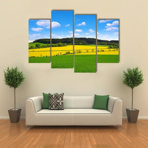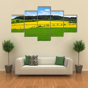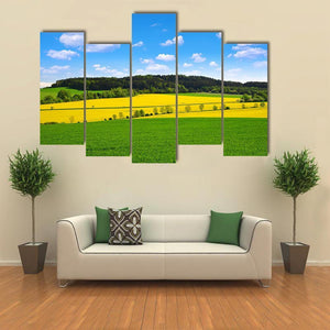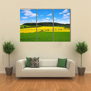 This canvas shows yellow rapeseed and green wheat fields divided by a row of trees under a blue sky with fluffy white clouds. The realistic landscape feels vibrant, peaceful and expansive. It fits well in modern, nature-inspired rooms such as living rooms or bedrooms.