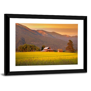 This canvas wall art captures a serene landscape featuring a rustic red barn amidst fields under the warm glow of an evening sunset. The rich palette of yellow, green, and orange evokes a peaceful atmosphere perfect for any nature lover.