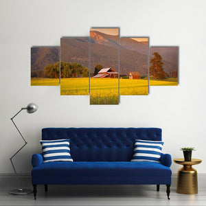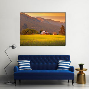 Rapeseed Field and Red-roof Barn in Evening Sun Canvas Wall Art