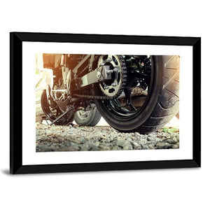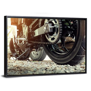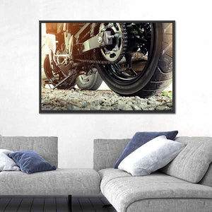 This canvas wall art features a close-up view of a motorcycle's rear wheel, chain, and sprocket, captured in a gritty and detailed manner. The industrial style and warm sunlight filtering through create a powerful atmosphere, making it a perfect addition to any bike lover's collection.