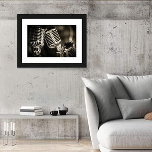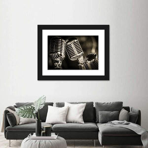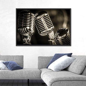 Microphones rendered in sepia tones set a nostalgic, vintage mood. The rule-of-thirds composition and a black, white, and gray palette give the image a classic feel that suits music rooms, home studios, or modern interiors.