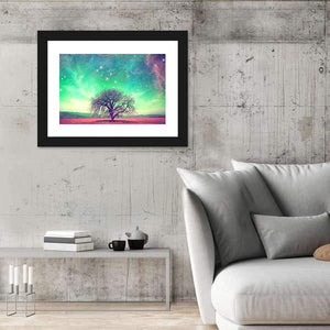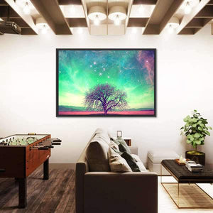This canvas features a surreal landscape dominated by a bare tree, set against a vast sky filled with stars and vibrant nebula clouds. The dreamlike palette of green, blue, purple, and pink creates a cosmic and serene atmosphere, making it a captivating addition to your wall decor.