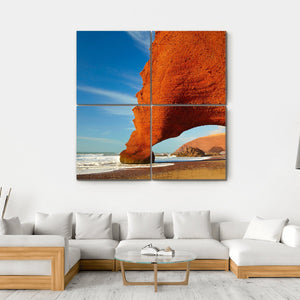 This beautiful canvas art features a natural arch on the Atlantic Ocean coast, surrounded by a serene beach and an expansive sky. The bright palette of orange, blue, and tan creates an airy atmosphere perfect for uplifting any space.