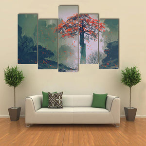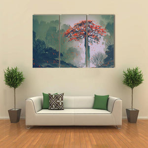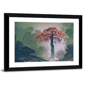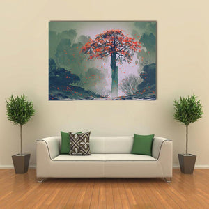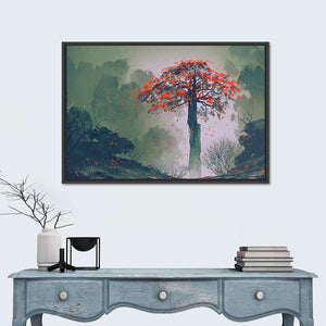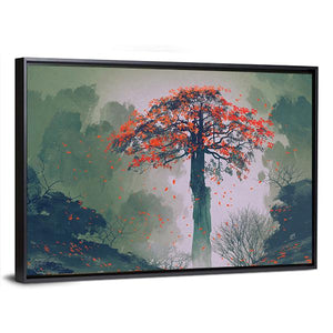 Red Autumn Tree Canvas Wall Art features a tall, slender tree with red and orange autumn leaves set against a misty forest. The centered composition and atmospheric depth create a mysterious, serene scene in tones of green, orange, brown and gray. A natural fit for modern home and room decor.