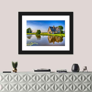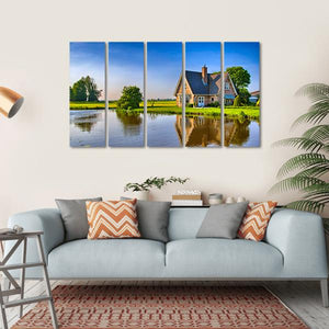 This vibrant canvas features a red brick house nestled by a serene lake, surrounded by lush trees and a yellow field. The peaceful scene captures the beauty of nature with the house reflecting in the calm water, creating an idyllic atmosphere.