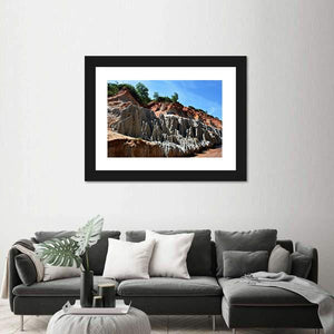 Red Canyon In Vietnam Canvas Wall Art depicts layered rock formations and weathered cliffs topped with lush trees beneath an open sky. The natural palette of red, brown, gray, green and blue gives the scene a calm, earthy mood. It fits well in modern homes or nature-themed room decor.