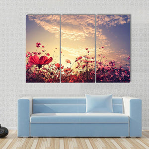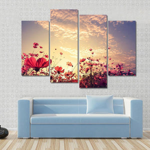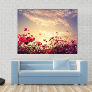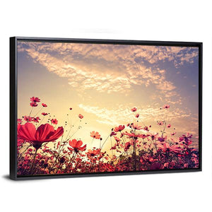 Explore a serene landscape of vibrant cosmos flowers set against a warm sky. This dreamy canvas art captures sunlight filtering through clouds, adding a peaceful touch to any room.