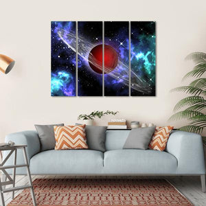 This canvas art features a captivating red gas planet surrounded by prominent rings and swirling blue and teal nebulae. The cosmic scene, adorned with sparkling stars against a dark background, evokes a mysterious and awe-inspiring atmosphere, making it a striking addition to any art collection.