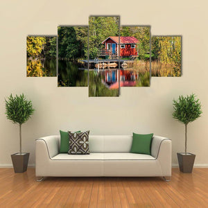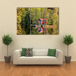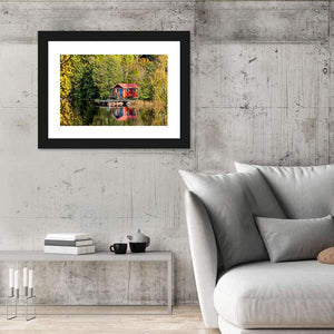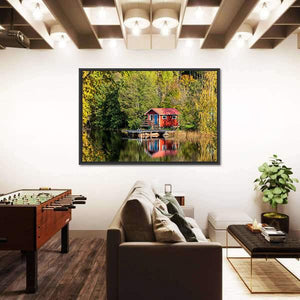 Red Cabin by Lake with Wooden Dock Canvas Wall Art