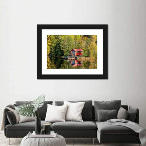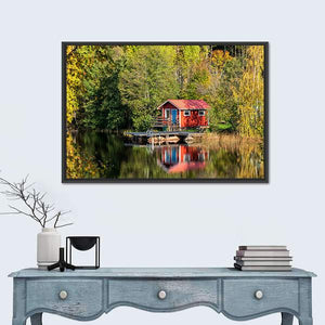 This canvas art features a charming red boathouse beside a serene lake, surrounded by autumn trees. The tranquil scene showcases calm water reflecting the vibrant hues of red, green, yellow, and blue, creating a peaceful atmosphere that enhances any space.