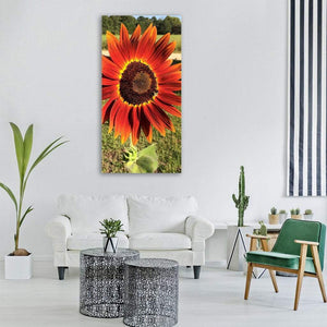 A photorealistic close-up of a red and orange sunflower with a small bud beneath the main bloom, suggested in a daytime garden. Its vibrant orange, yellow, brown and green palette brings a natural, cheerful touch to modern or nature-inspired rooms.