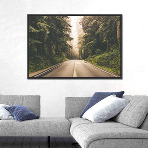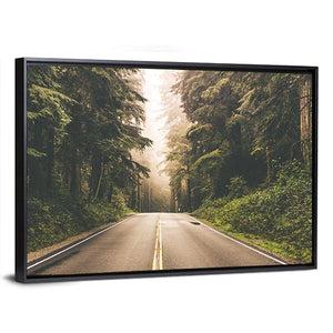 This canvas art captures the serene beauty of a road winding through a foggy redwood forest in California. The realistic depiction evokes a tranquil, mysterious atmosphere, making it a perfect addition to any nature-inspired decor.