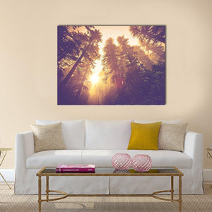 This redwood forest scene shows tall trees and sunlight from a low-angle perspective, with sun rays piercing through the trunks. Warm gold and purple tones create a serene, majestic, and slightly ethereal atmosphere, suitable for living spaces with natural or vintage decor.