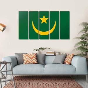 This canvas wall art features the flag of Mauritania, showcasing a bold green background adorned with a yellow crescent moon and star. Its graphic design and symmetrical composition make it a striking piece that embodies symbolic meaning.