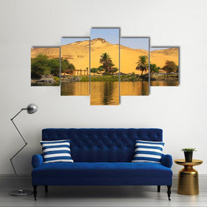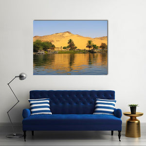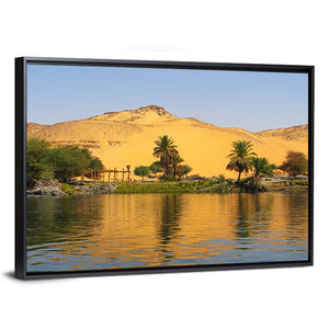 This canvas wall art captures the serene beauty of desert dunes and palm trees reflecting over the tranquil Nile River. The warm palette of yellows, blues, greens, and browns evokes a peaceful atmosphere, making it a lovely addition to your space.