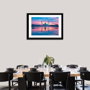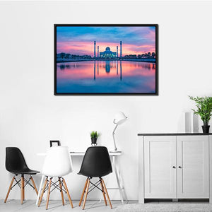 This canvas artwork beautifully captures the serene reflection of a mosque in a tranquil lake, set against a stunning sunset sky. The harmonious palette of pink, blue, and purple creates a peaceful atmosphere, making it an inspiring addition to any wall decor.