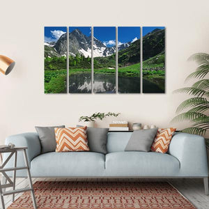 This canvas art beautifully captures a serene landscape of snow-capped mountains, a calm lake, and lush green hills. The artwork evokes a peaceful atmosphere that invites tranquility into any space.
