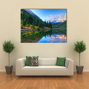 This canvas wall art depicts a serene landscape featuring a mountain lake reflecting stunning snowcapped peaks and vibrant autumn foliage. The rich colors of green, blue, and warm yellows evoke a colorful, majestic atmosphere that adds a touch of nature to any space.