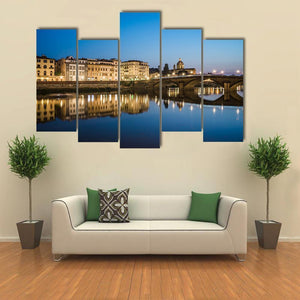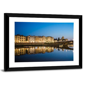 Reflections In The Arno River depicts a photorealistic cityscape with a bridge and buildings mirrored across the river. A cool palette of blues with yellow and white highlights creates a calm, tranquil dusk atmosphere, with lights reflected on the water. It suits modern home spaces such as living rooms, studies, or entryways.
