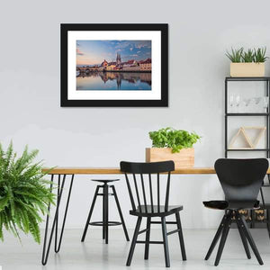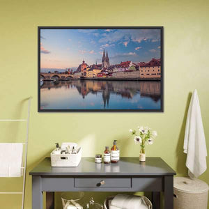 A photorealistic cityscape of Regensburg featuring the river, bridge and a skyline anchored by twin cathedral spires. Sunset blues, warm yellows, reds and browns create a calm, serene, picturesque mood that fits modern room decor.