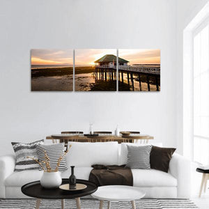 A panoramic view of a stilt house and wooden pier at sunset in Calatagan, Philippines, with calm water reflecting warm orange and gold light. The photorealistic landscape feels calm and serene and suits coastal or modern room decor.