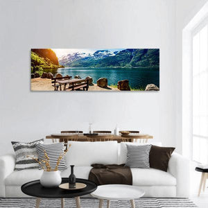 Bench Near Lake Panoramic Canvas Wall Art shows a quiet bench beside a mountain lake with snow-capped peaks and sunlight hitting the trees. The nature photograph uses blues, greens, white and brown across a panoramic composition for a peaceful, serene, majestic mood. It fits living rooms and nature-themed spaces that favor calm, scenic wall art.
