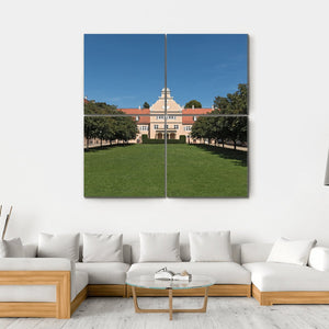 This canvas art captures the serene beauty of the Renaissance Hunting Castle Kranichstein, set amidst lush greenery and a clear blue sky. The symmetrical composition features a grand tan building with a striking red roof, inviting calm and tranquility into any space.