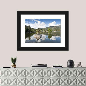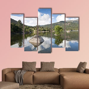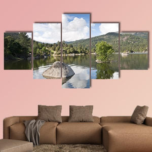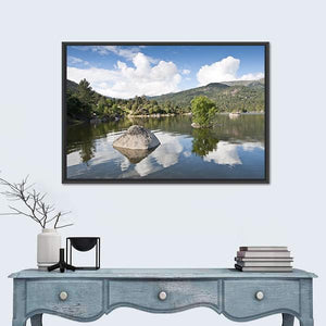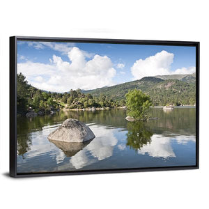 This canvas depicts the Reservoir of El Burguillo in Avila, Spain, showing lake water, a rock in the water, trees and distant mountains under scattered clouds. Calm blue, green and grey tones and soft cloud reflections give the scene a serene, natural mood that fits modern or nature‑inspired rooms.