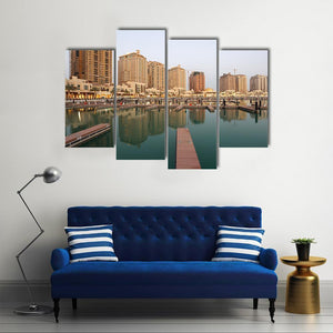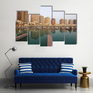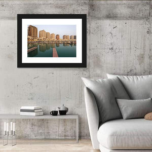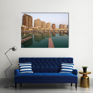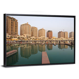 This horizontal canvas art beautifully depicts modern buildings alongside a tranquil marina. With serene reflections in the water and wooden docks, it conveys an urban yet calming vibe, perfect for enhancing any cityscape-themed decor.