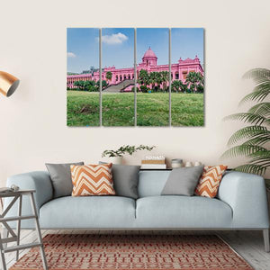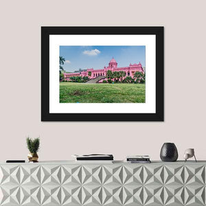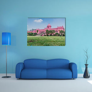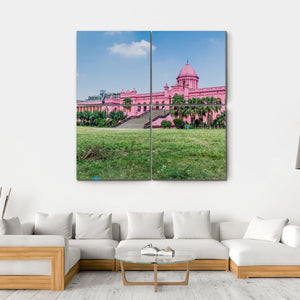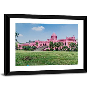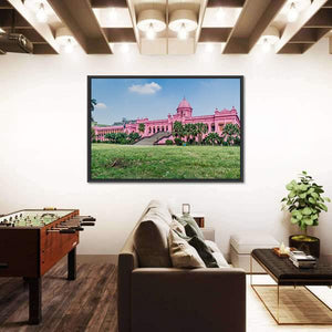 This canvas artwork features the majestic pink palace of the Nawab of Dhaka, surrounded by lush green grass and graceful palm trees. The serene sky, adorned with fluffy white clouds, enhances the grand historical vibe, making it a striking piece for any decor.