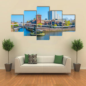 A sunny, realistic canal scene featuring an arch bridge, brick buildings, a lock mechanism and flowing water. The composition follows the rule of thirds and uses blue, brown and white tones for a calm, daytime atmosphere. Suits modern or urban living spaces and complements contemporary décor.