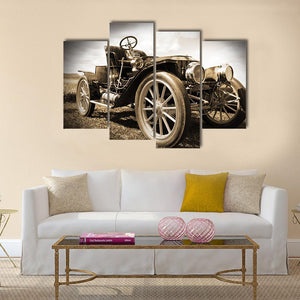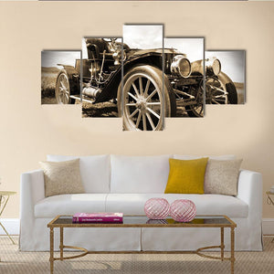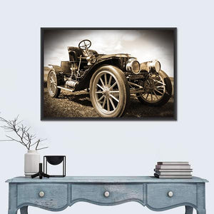 A full-shot, eye-level image of a vintage car rendered in sepia, white, black and brown tones to create a nostalgic, classic mood. Visible spoked wheels, headlights and the steering wheel give the piece a historical, elegant feel that fits well in a living room, study, or automotive-themed space.
