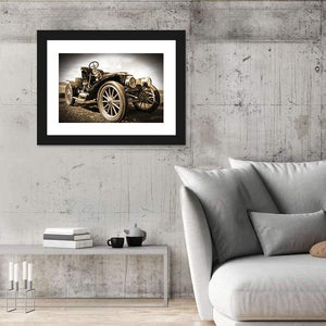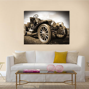 This vintage automobile canvas captures a nostalgic scene of a classic car amidst a grassy field. The sepia and brown tones evoke a sense of history, making it a timeless piece for any art lover.