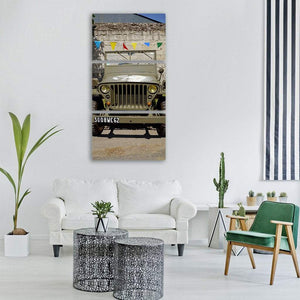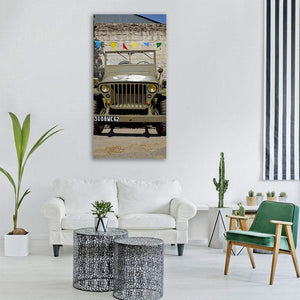 A front-view image of a vintage Jeep Willys shown eye-level, with a star emblem on the hood and the license plate reading '3008WC62'. Colorful bunting stretches across the top and the olive green, tan and red palette creates a nostalgic, celebratory vintage mood. A good fit for automotive spaces or vintage-themed rooms.