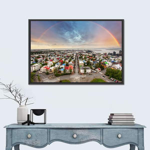 Experience the serene beauty of Reykjavik’s skyline with this captivating canvas art. Featuring colorful buildings, an arch of rainbow, and a tranquil body of water, it brings a peaceful, scenic vibe to any space.