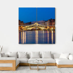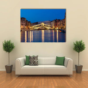 This stunning canvas features the iconic Rialto Bridge in Venice, beautifully illuminated against a colorful night sky. The enchanting reflections on the canal create a serene atmosphere, making it a striking addition to your wall decor.
