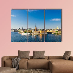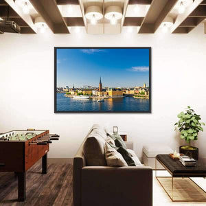 Riddarholm Church Near Lake Malaren shows a wide-angle photographic view of the city waterfront, featuring the church’s tall steeple, boats on the water, and a clear blue sky. The bright, sunny palette of blues, yellows, white, and grey gives the scene a calm, serene feel. This canvas print fits modern room decor and works well in living rooms or offices.