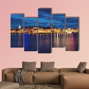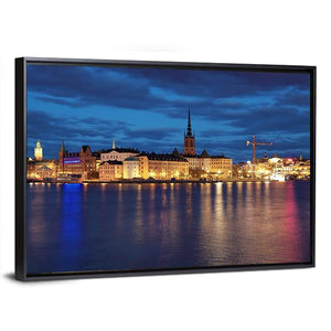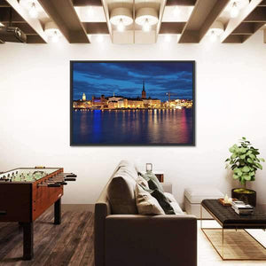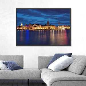 Stockholm’s Riddarholmen and Gamla Stan are captured in this modern cityscape canvas, showing the waterfront skyline and a spire reflected on the water. Blue and orange night lights against dark clouds create a serene yet vibrant urban mood. Fits modern living spaces and room decor as a calm focal piece.